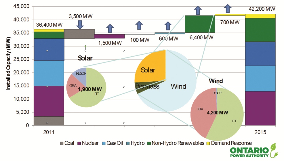 Graph 1: 9300 MW of new capacity are projected to be added to the Ontario system between 2011 and 2015. Most of the increase is in non-hydroelectric renewables with wind representing about 2/3 of that group. In terms of the business arrangements, most of the new projects will come in under the FIT program or be related to the Green Energy Investment Agreement (GEIA) with Samsung.